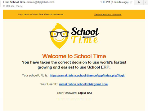 - Below image shows the confirmation mail with admin credentials to login your own School Time