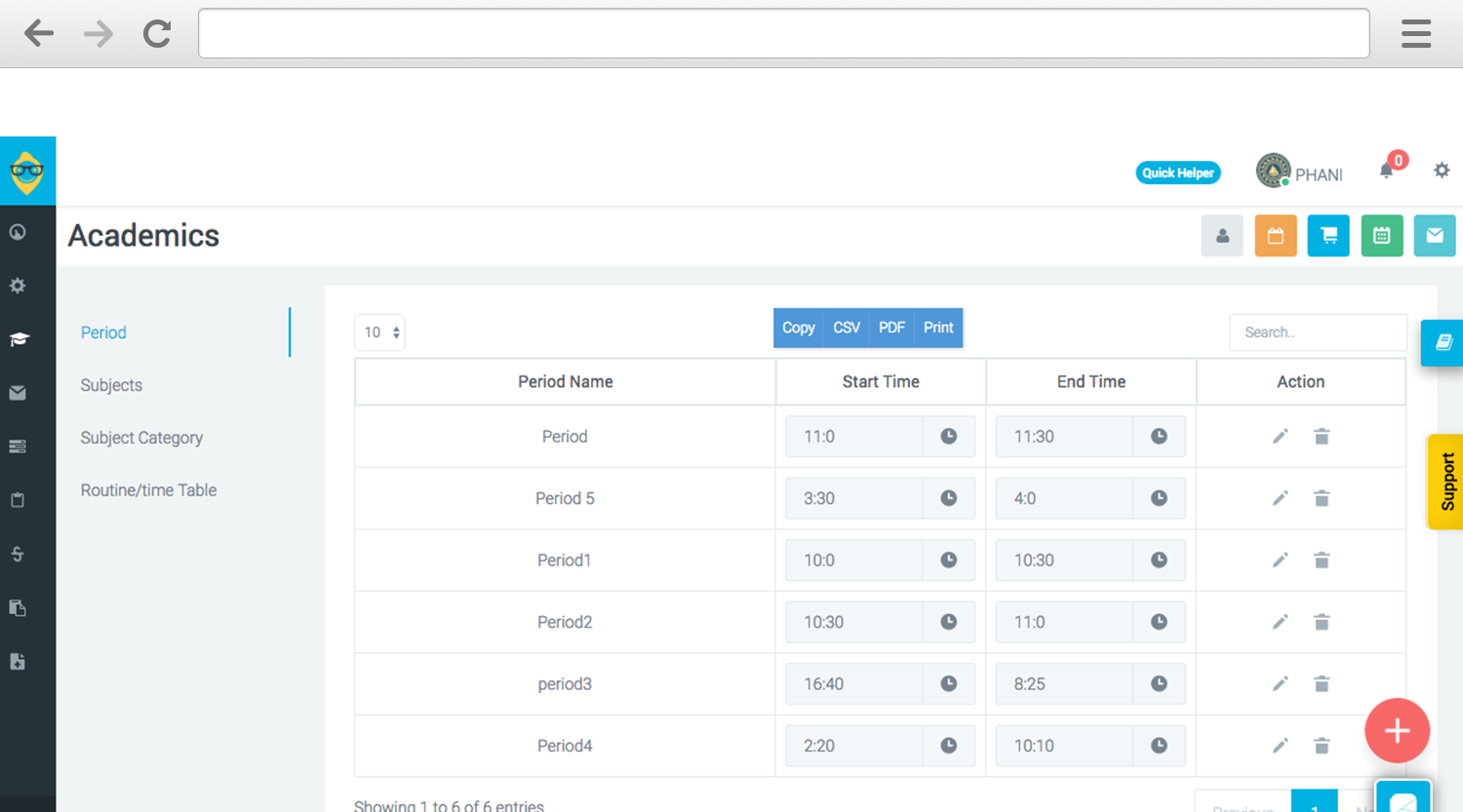 The Academics Modules creates the Subjects being taught at your Institution along with its categorisation if required. Subject categories help in creating different grading types. Here you can also create the standard Period settings along with Start and End Time, and finally set up the Class Routine or Schedule.